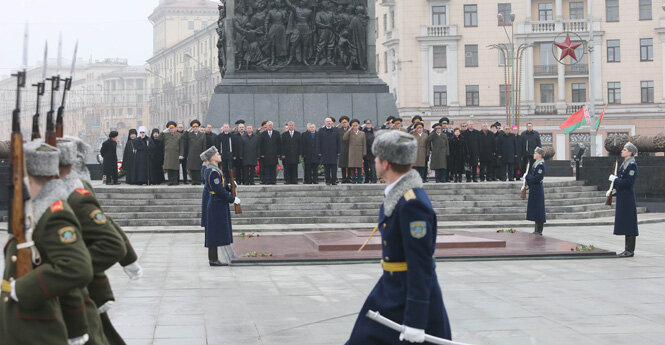 В День защитников Отечества и Вооруженных Сил Президент Беларуси также возложил венок к монументу Победы в Минске.